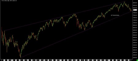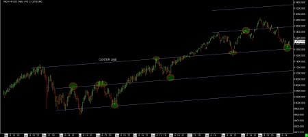 The second chart shows possible upside targets should the market resume its uptrend. The trend lines are called an Andrews Pitchfork. It has had multiple contact points on every line except the upper trend line. The upper trend line is based on an imaginary point that produced desired results on the other trend lines. It is a theoretical work and would only have possible use if the market were to resume its advance.