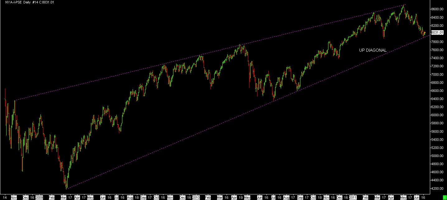 The first chart shows the NYSE Composite since October 2008. The trend lines on this chart have produced some significant turning points. Presently we have stopped on the lower trend line that connects the March 2009 bottom and the June and August 2010 bottoms. The upper trend line originates with a peak in November 2008 and has had 5 contacts points, 1 in 2009, 2 in 2010 and 2 in 2011. It will be interesting to see if the market will turn up from contact with the lower trend line.