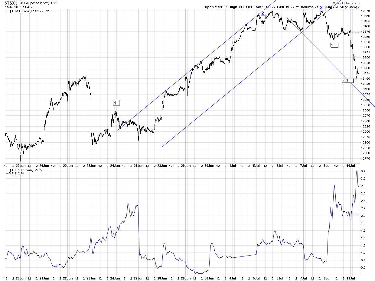 We are in a multi-step down, which began last Friday and are currently in step 2 down. Is this the end of the advance that began on June 16th. It’s possible, but I’ll wait for confirmation before issuing a short term sell signal. A short term sell could possibly involve an intermediate term sell too. It would mean that the decline from May 2 to June 16 was only step 1 down and we were at the half way point (down) on June 16. We’ll have to wait and see how this works out.