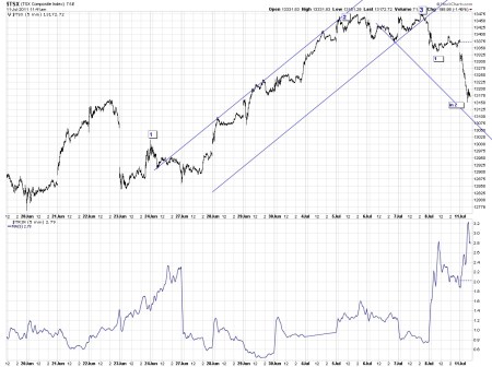 Presently this is the scenario of the head and shoulders formation coming true. I had said before that too many people were looking for this scenario. It all seems too comfortable to fit as the stock market doesn’t usually work so easily. But strange things can and do happen, so we’ll wait and see the resolution without making up our minds prematurely.