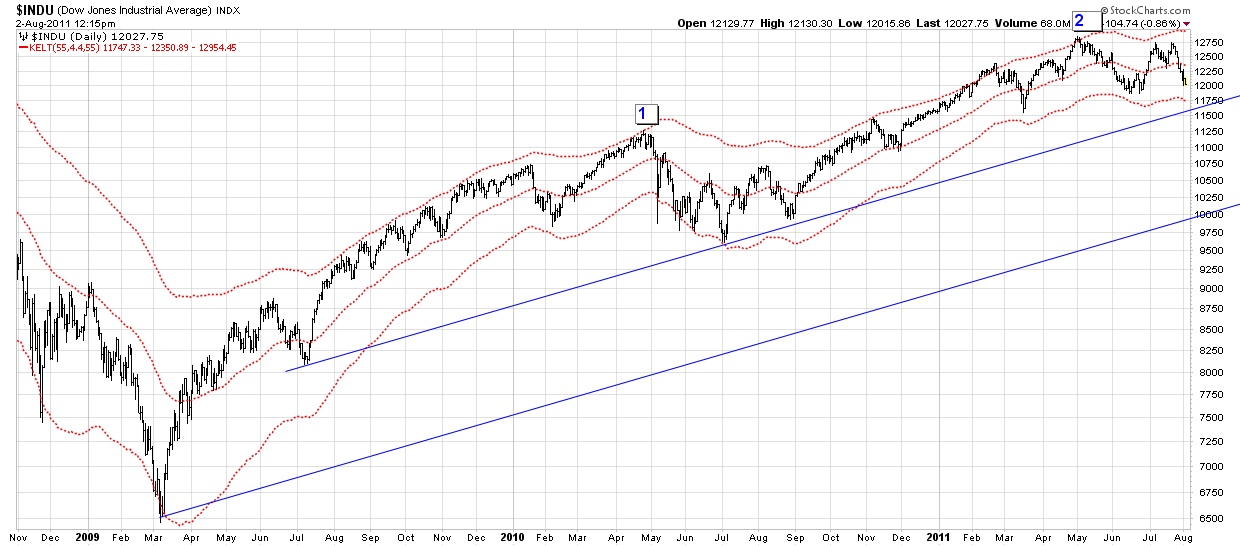In the first chart you can see the correction following the first step up lasted 2 1/3 months and was about 13 percent deep (May to July 2010). The expectation is for the second step to exceed both of these figures. Presently the correction is beginning it’s fourth month in the Dow Industrials (longer than that in other indexes).