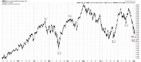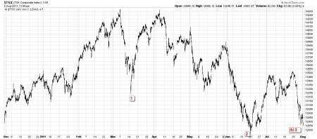 In the next chart (DJ Industrials) you can see a rather unorthodox labeling for the decline (red numbers). This will make sense when you compare this chart with the next chart (TSX Composite Index). The second chart (TSX) shows a decline that began in March 2011 while the first chart (DJ Ind) began its decline in May 2011. The expectation is that these charts will line up perfectly on the bottom with a completed wave count.