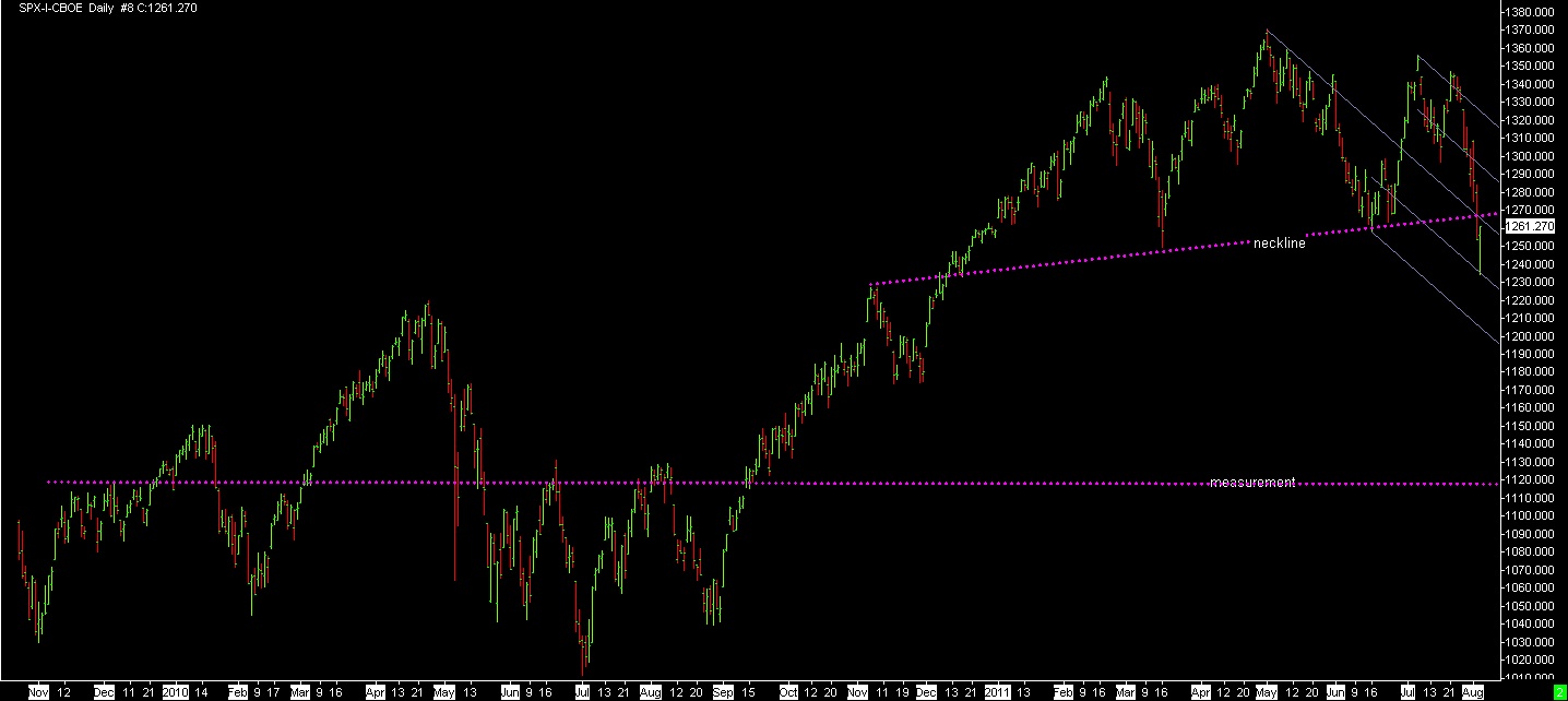 The next chart is the SP 500 and it shows the head and shoulders formation with the neckline.  The neckline has been penetrated and we should rally back to the neckline (or higher) before the head and shoulders destruction takes place (maybe?).
