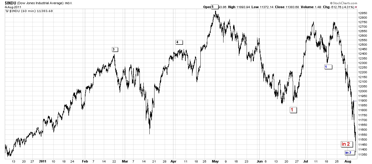 The first chart is the Dow Industrials (60 minute bars) and gives perspective to what has happened in recent days. Yup, that’s a crash. The wave count shows that we are likely in step 2 . . . . of larger step 2. That means that we have further to go before we have a bottom.