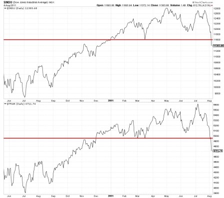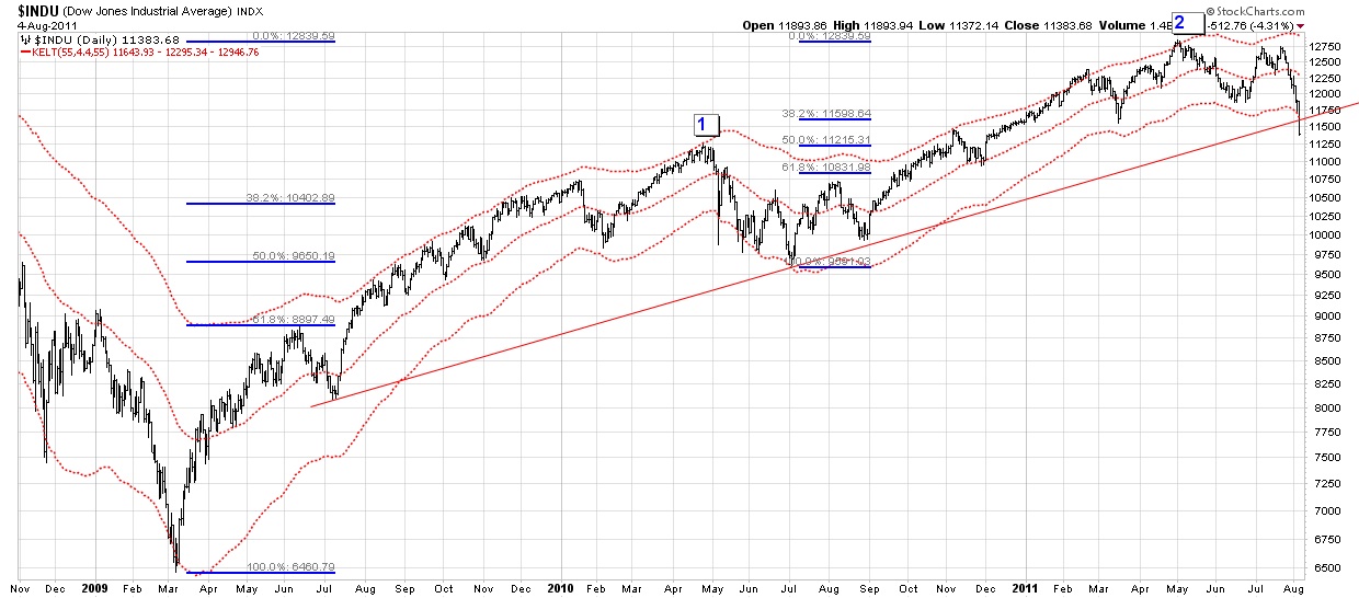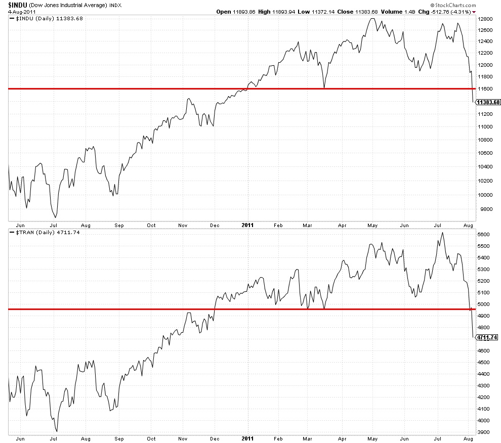 Today we had a Dow Theory Sell Signal. The chart below shows the Industrials and Transports making new lows below the March 2011 lows. The theory verifies that we are in an intermediate to long term correction. After the peak in October 2007, the market had a Dow Theory sell signal on November 21, 2007. That turned out to be very good advice at that time.