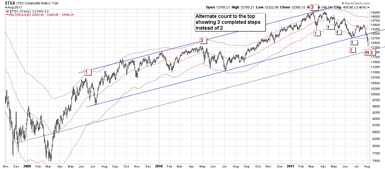 The next chart is a daily bar chart for the Toronto Stock Exchange and it shows an ALTERNATE count to the February peak. It’s labeled as a completed 3 waves instead of the nominal 2 waves that I have shown before. It’s a secondary wave count possibility since March 2009.