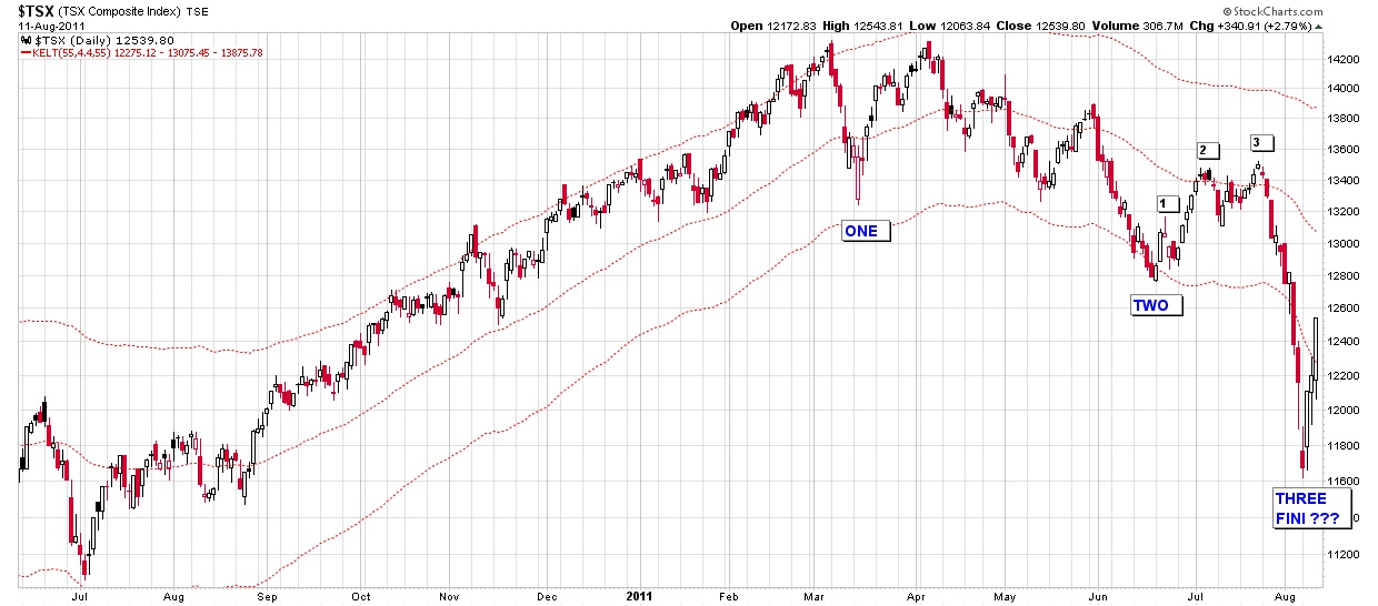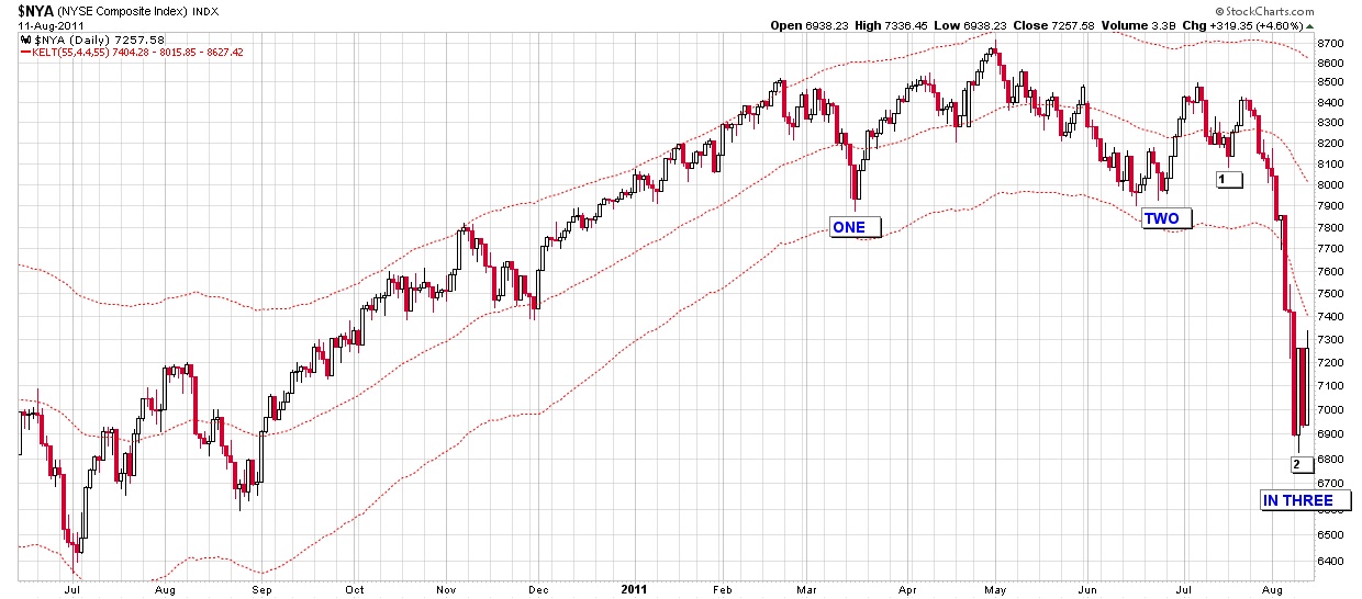 Which chart is right? They both might be right. Here’s how. The first chart could have a second low higher than this week’s low while the second chart could have a second bottom close to (or lower than) this week’s low. If commodities do well on this rally that would create a situation where the first chart would not have a lower low. This is true because the first chart is Canadian blue chips and Canada’s economy has a bias towards commodity exports. The second chart is the New York Stock Exchange Index and it has a heavy weighting towards financial companies. We all know that the financials have been taken to the woodshed. A secondary bottom would be expected in such a weak sector.