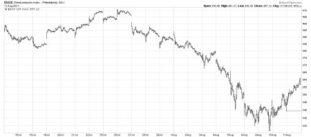 Continuing with the thought that the downtrend is not complete, the following chart is the semiconductors and it illustrates the breaking of the downtrend channel. If the market were to turn down immediately, it would raise the possibility that we are sub-stepping the downtrend. Since the market was so deeply oversold, it seems likely that we will rally for a week or so to relieve the oversold condition. A rally lasting a week or so would leave no doubt that step 2 down is finished.