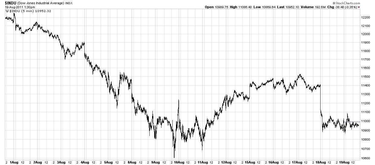 - Possibility: From the decline that began last Wednesday (08/17/11), we have completed only step 1 of 3 steps down. Lower lows later today (Friday) will validate this count.