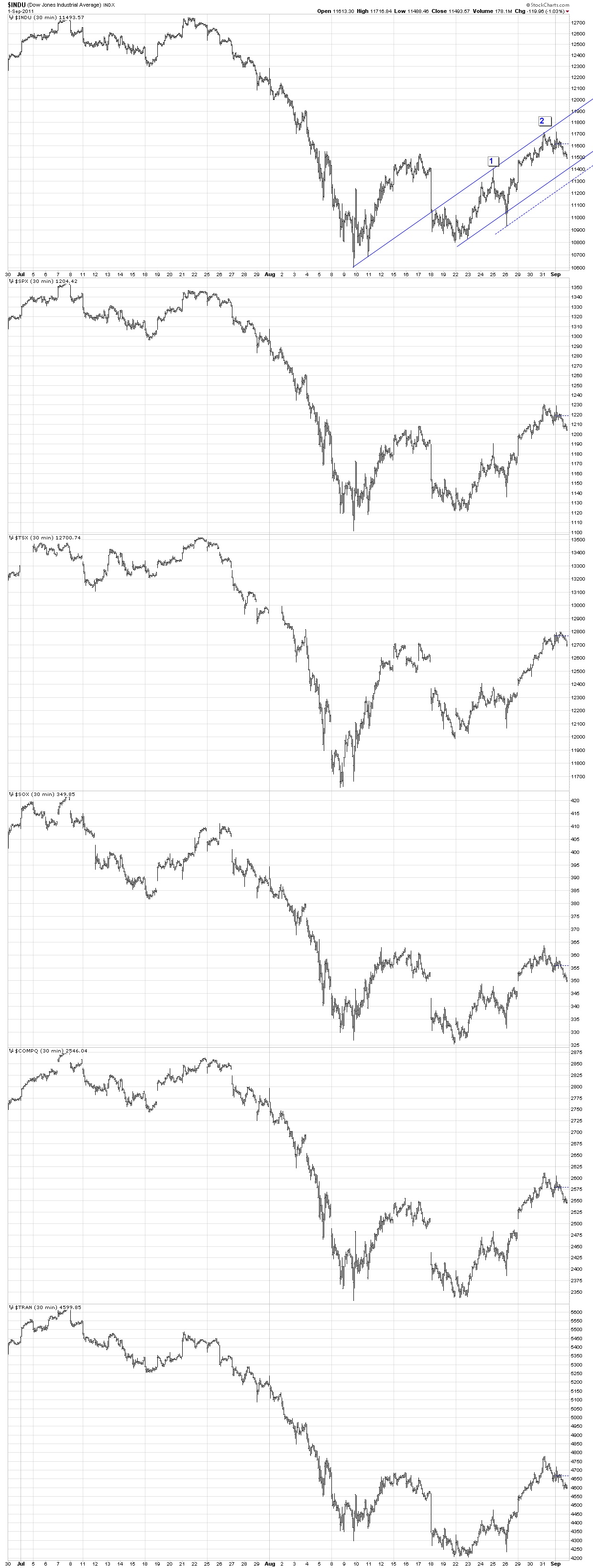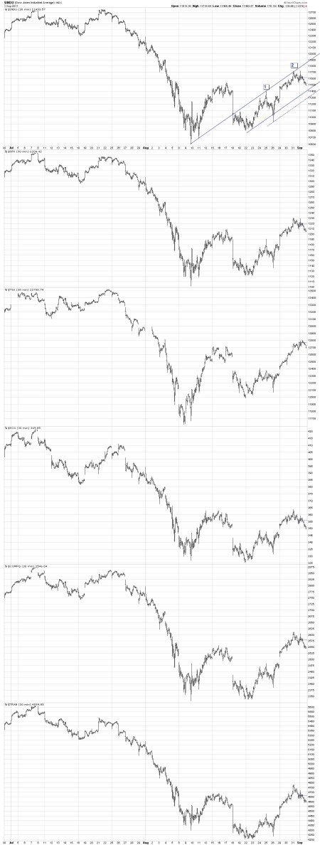 In the first chart are lines outlining the expected channel with the dotted line representing an approximate extreme. The dotted line is about 200 Dow points below today’s close. The dotted line also marks the approximate highs of step 1 around the 11,250 level.