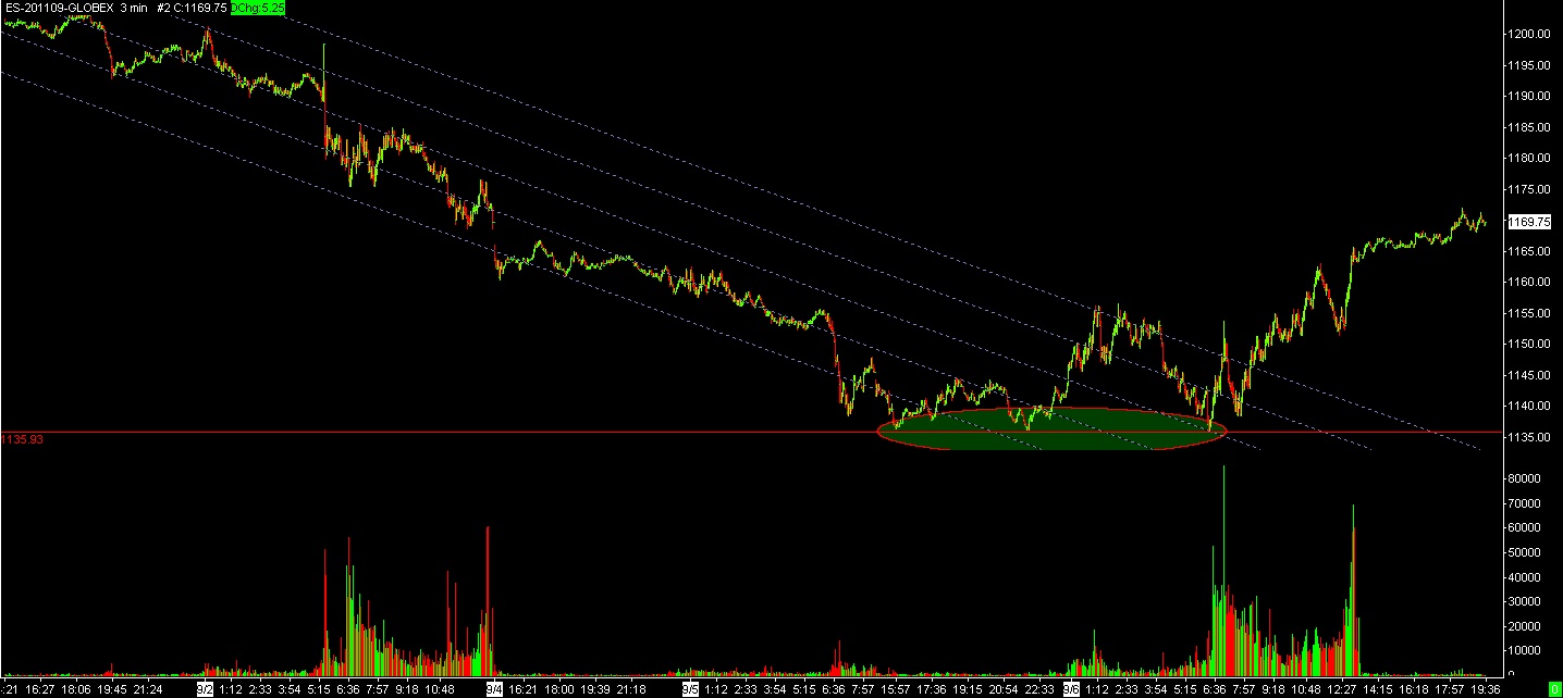 Today the market opened down about 310 Dow points and improved from there to finish down 101 points. As expected the opening volume was heavily slanted towards the sell side and was 95% down. By the close the volume had improved to 80% down. Over the preceding 24 hours we had a small triple bottom with the first and second low coming in the evening Monday. The third bottom came at Tuesday’s open and since that level wasn’t violated later, it was an invitation to buy. The reversal point came where it was expected, almost exactly at the August 22nd low.
