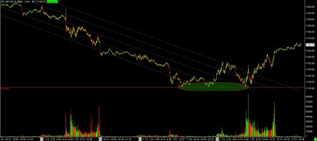 The second chart shows the small triple bottom that occurred today and the subsequent rally.
