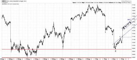 Obviously today was a fun day for the bulls.  The market advanced all day showing good strength and closed on the high for the day.  The chart below shows the wave count and a possible channel.  We’ll have to wait a few days to see if this channel is going to work.  The narrow channel will obviously fail and is simply to show the current step.