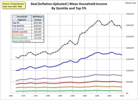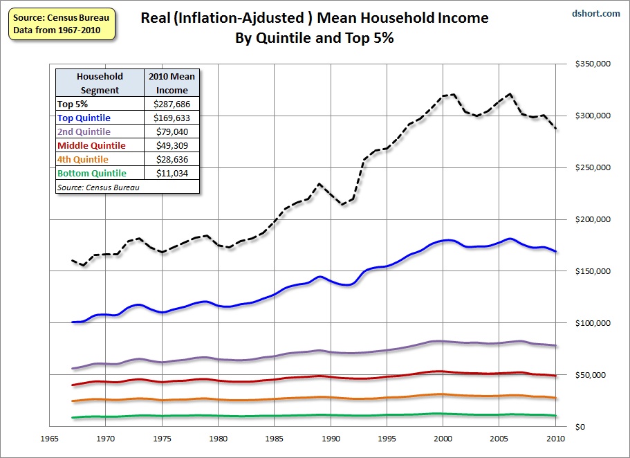 Here is an interesting chart on the household incomes in America broken down by quintile (20% segment).