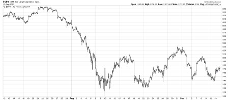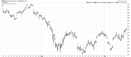 I’m still on the sidelines waiting for the market to give me a clear message. An encouraging situation is the performance of the semiconductors (SOX). This sector continues to outperform the market and has looked good since August 9th. As I have said before, the SOX will frequently have a change in trend before the overall market. See charts below.
