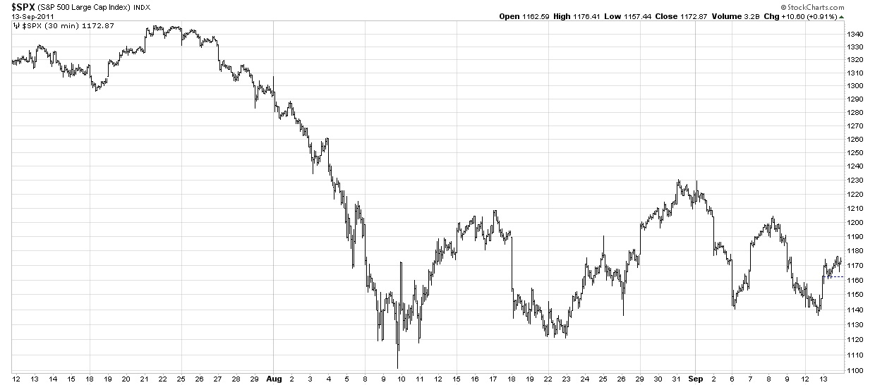 The latest bottom in the SP 500 didn’t have a clear wave count and that kept me on the sidelines at yesterday’s reversal. Because I’m on the sidelines, I may not update this blog until I have something of interest to contribute. We’ll see how that goes as it seems that I have problems sitting quietly and saying nothing.