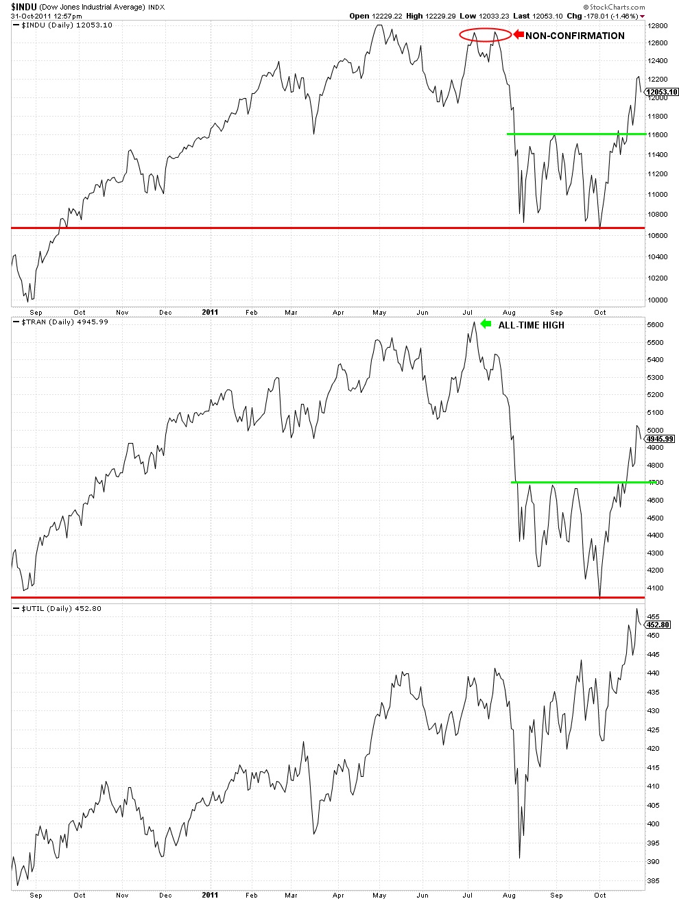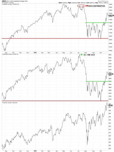 “Webster’s defines the word “crescendo” as, “The peak of a gradual increase; or a climax.” And, that’s the climatic feeling I got last Thursday when the D-J Industrials (INDU/12231.11) sprinted some 340 points on the European euphoria to close above 12000 for the first time since August 2, 2011. Such action caused one old Wall Street wag to exclaim, “Buy on the cannons and sell on the trumpets!” Clearly we bought on the “cannons” back on October 4th when the indexes broke below their respective August 8th and 9th selling-climax lows. That “call” was driven by the belief the October 1978/1979 analogues would continue to play. Recall those late 1970s patterns saw the averages slightly undercut their “selling climax” lows before the bottoming process was complete. Accordingly, we termed this year’s October peek-a-boo “look” below the early August lows as an undercut low and advised participants to buy the index of their choice.