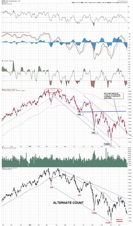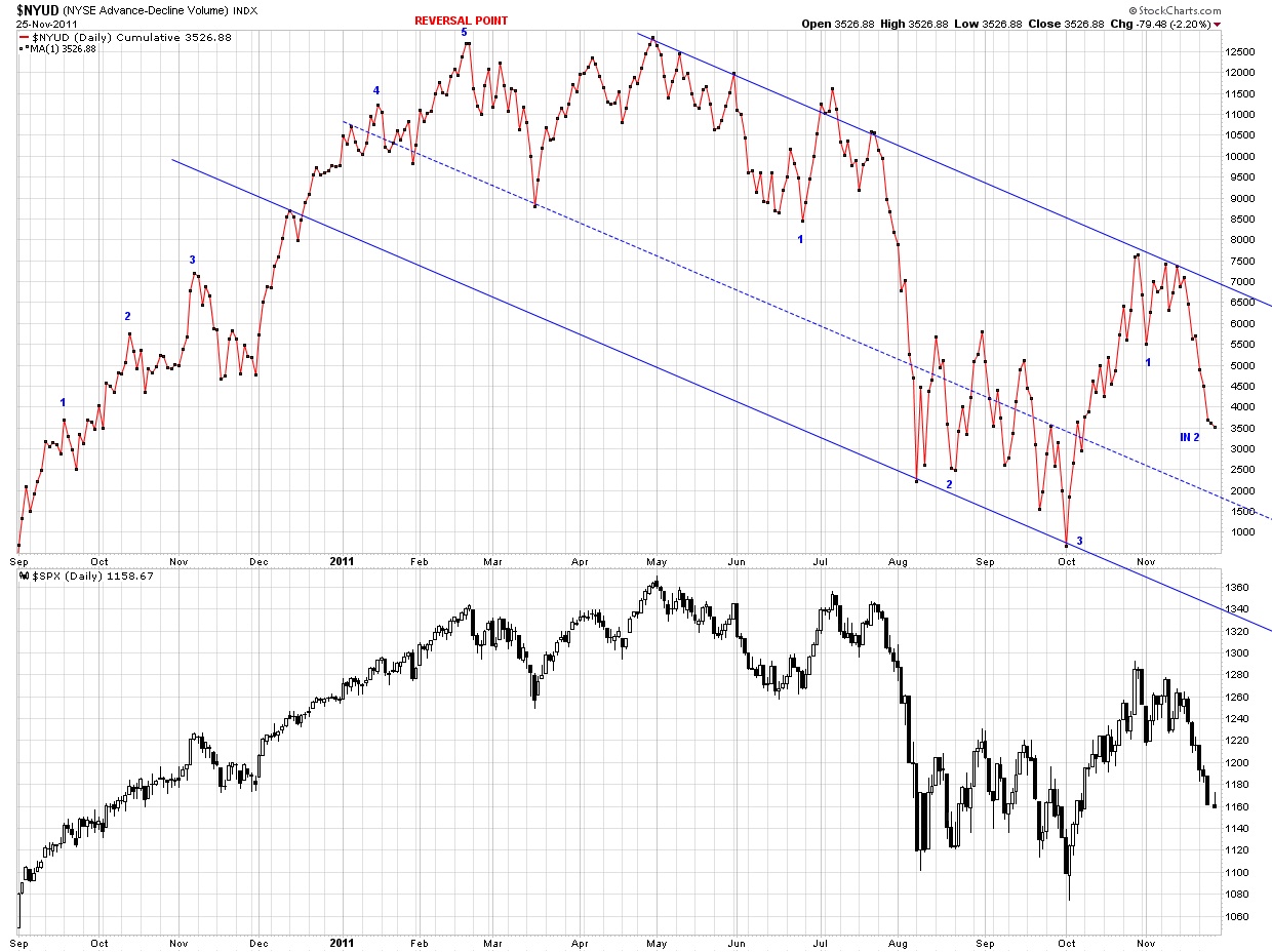 I’m troubled by the possibility that my wave count since February 2011 is incorrect. If I have made a mistake, it would mean we are going to have one more step down (5th step). In the chart below are some indicators first, followed by my accepted wave count and last is the alternate count. The alternate indicates one more thrust to new lows. Unfortunately the problems in Europe make this alternate count a possibility.