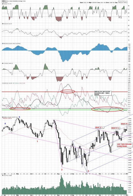Now that’s one scary chart (the red wave count). This is just one of those “what if” things that bother me from time to time (all the time actually). It could gain credibility if the correction running into later January becomes a lot wilder than anticipated. I’ll be keeping an eye on this possibility in the days ahead. Incidentally, I always have a scary chart that I can pull out and show whenever the mood strikes.