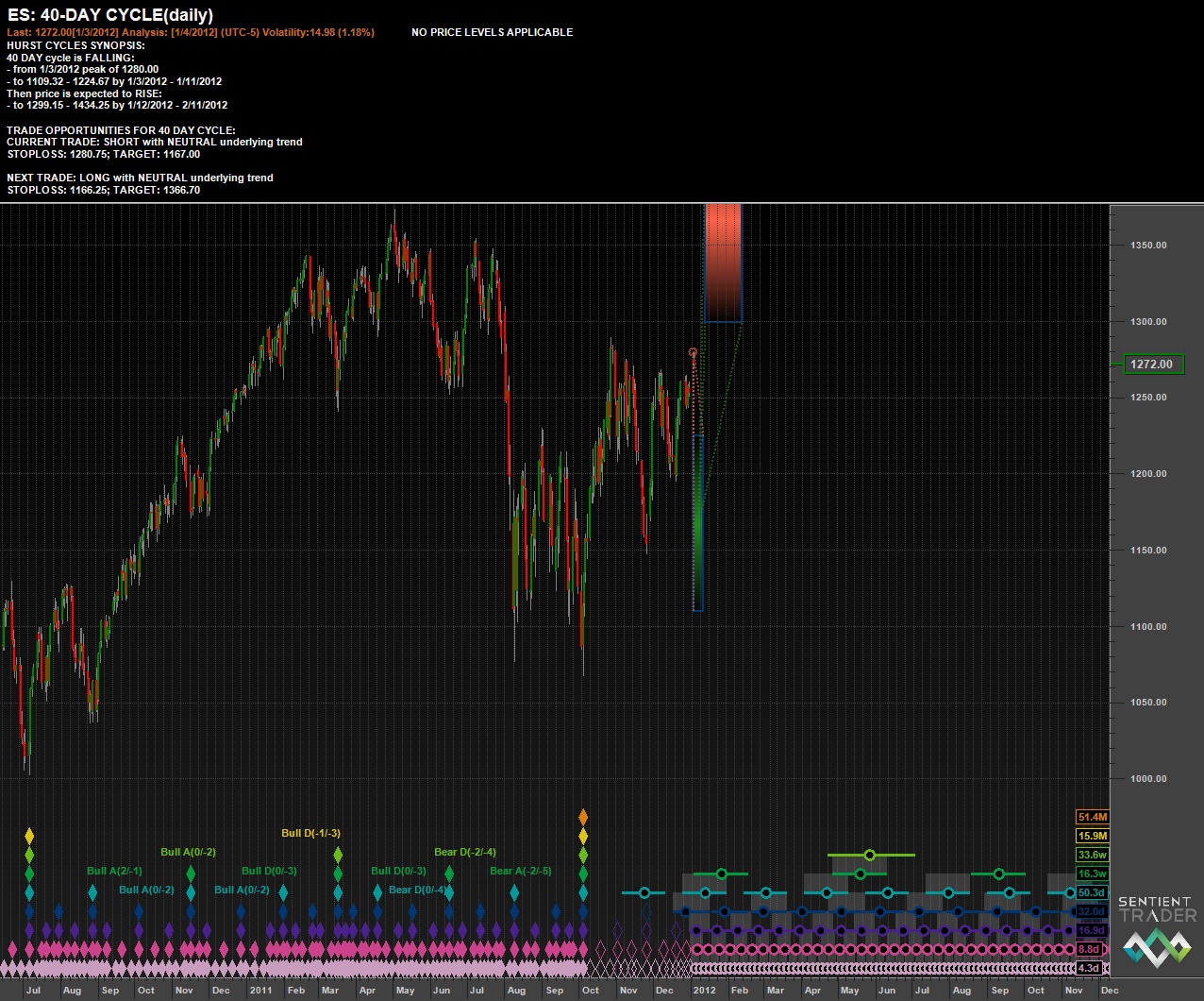 As you can see by the above chart we are heading for a low during January that will be much less significant than the October 4, 2011 low. The October low was a 51 month cycle low, while the January cycle is a 16 week cycle low (green circle and line in the above chart). According to JM Hurst’s principle of synchronicity, cycles are phased so as to cause simultaneous troughs for all cycles of shorter duration than the cycle in question. All cycles less than the 16 week cycle will bottom at the same time as the 16 week cycle meaning they will all have a common trough date.