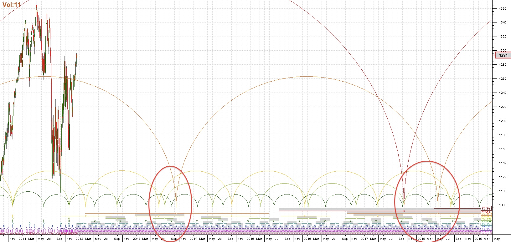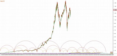 The first chart is the SP 500 cycles from 1950 to 2042. The semi-circle contact points at the bottom are cycle low dates. When we have numerous cycles bottoming at the same time or large cycles bottoming, these are usually important dates in stock market history. Due to the size of this chart, only the large cycles are visible. Obviously cycle lows shown beyond the present are predictions and not yet reality.