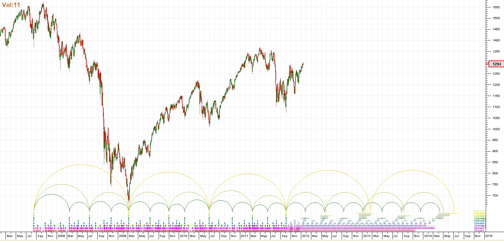 The next chart is a close up of the above chart and it shows a confluence of cycle lows occurring from May to September 2013. This appears to be anticipating the most important cycle bottom since March 2009.