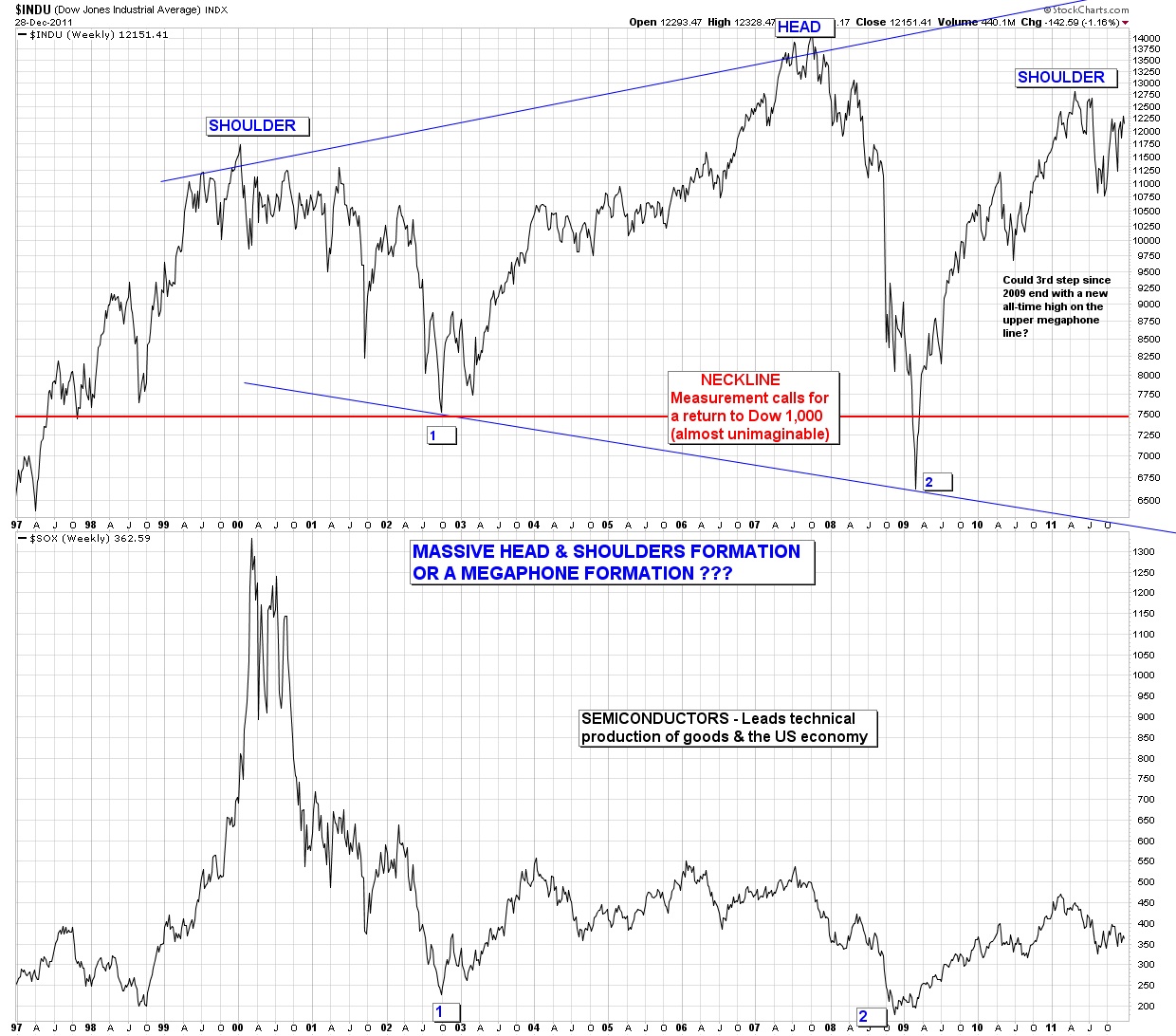 The lesser downside target of both formations is the megaphone formation as it likely calls for a bottom 1,000 to 2,000 points below the 2009 low, which would be around Dow 5,000.