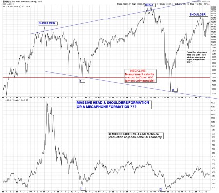 • We also have formed a huge head and shoulders formation since 1998.  If this formation is valid, the downside measurement calls for a bottom around Dow Jones Industrials 1,000.