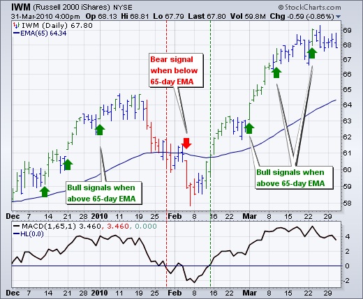 The Elder Impulse System can be used across different timeframes, but trading should be in harmony with the bigger trend. Elder recommends setting your trading timeframe and then calling it intermediate. Multiply this intermediate timeframe by five to get your long-term timeframe. Traders using daily charts for an intermediate timeframe can simply move to weekly charts for a long-term timeframe. The choice is not as clear cut for smaller or longer timeframes. A little judgment is required. Traders using 10-minute charts to chart their “intermediate” timeframe can use 60-minute charts for their “long-term” timeframe. Investors using weekly charts can base the bigger picture on monthly charts. Once the trading timeframe is decided, chartists can then use the longer timeframe to identify the bigger trend. This can even be accomplished using one chart. Chart 2 shows daily bars with the Elder Impulse System and the 65-day exponential moving average, which is five times the 13-day EMA. The long-term trend is considered up when SPY is above the 65 day EMA or when MACD (1,65,1) is positive.