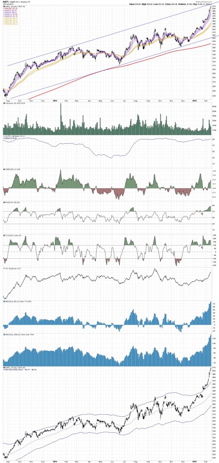 The stock price of Apple has had a very nice run since its consolidation around the $350-$360 level during the 4th quarter of 2011. The recent run up of about 150 points (over $500 presently) from $350 has been prompted by much better earnings than anticipated during the 4th quarter. This was caused by the blowout sales figures for the iPhone 4S plus the recent and long awaited announcement that the iPad 3 will be unveiled during the first week in March.