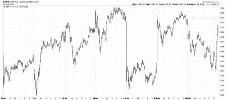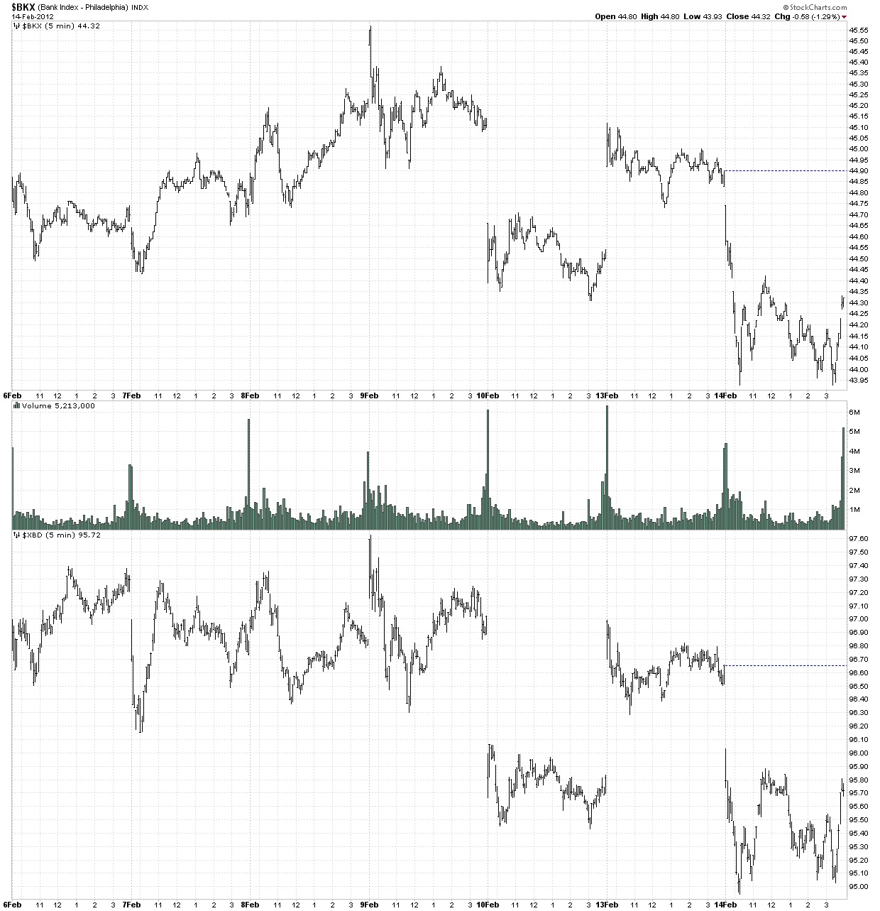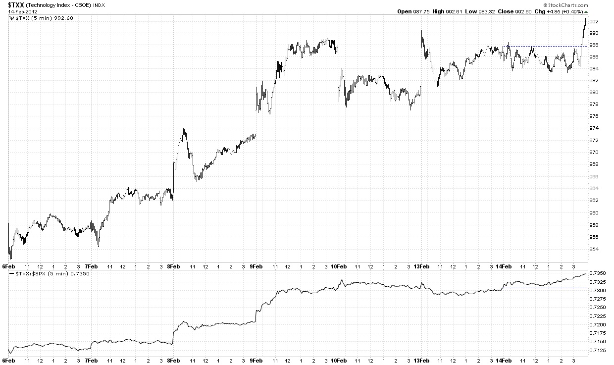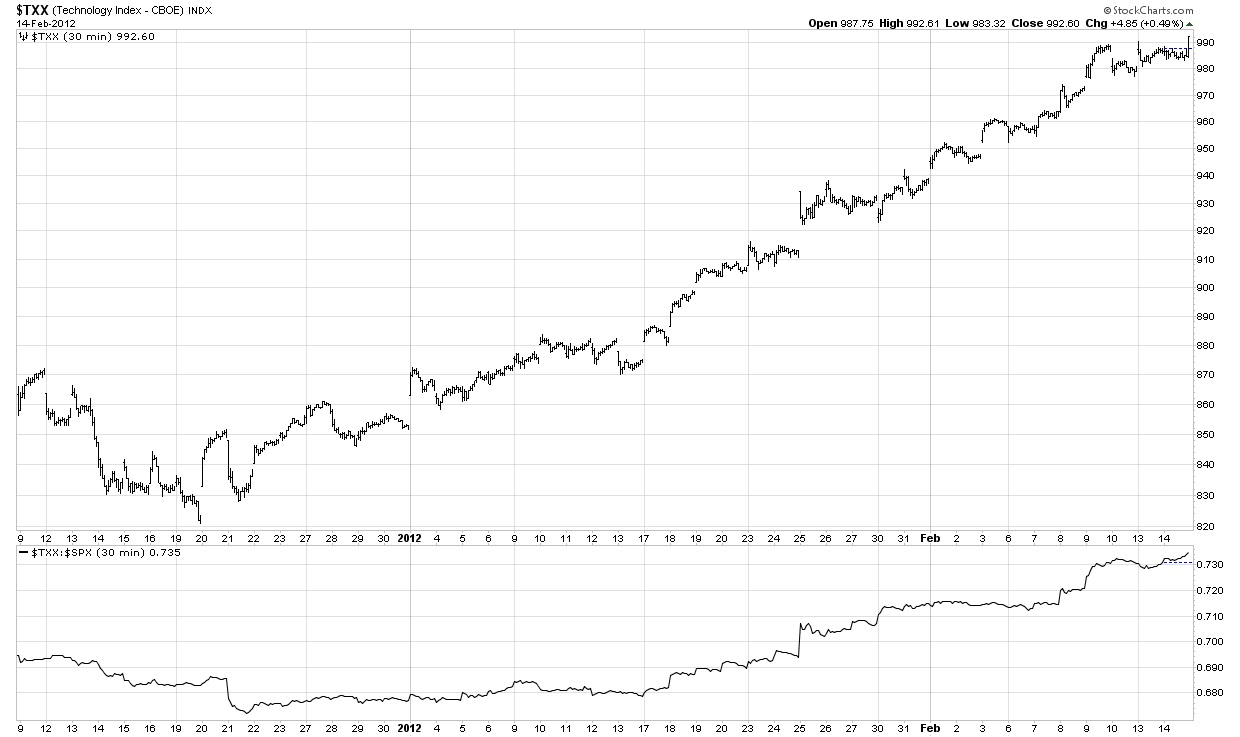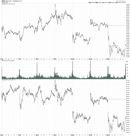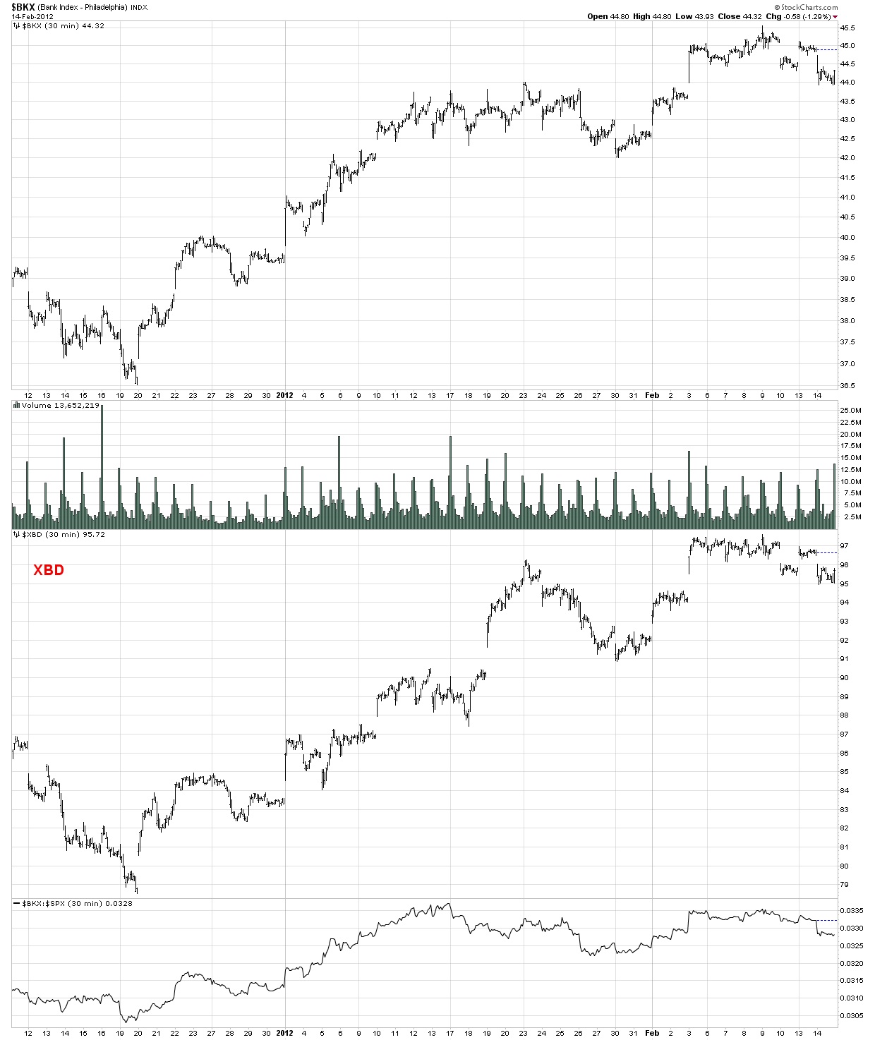 The next chart which is for the same time period as the TXX chart above is the banks (BKX) and securites broker/dealers (XBD) and it shows a rather clear 3 steps up since the December 19th bottom. A perfect example of why I have 10 indexes on each page for the same chart period (30 minutes).
