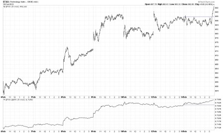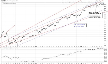 This index illustrates the strong and well confined channel that has been in effect since the December 19th bottom. Counting the steps in this index is not clear and is a perfect example of an extended uptrend where counting the steps has become next to impossible in real-time. This is where the channel break tells you when the step has ended. My theory is that when you lose track of the steps on the up or downside, the market move is an extended primary move. Counting the steps will be a lot easier when the channel break takes place, but for now we rely on the channel break, which doesn’t exist yet.