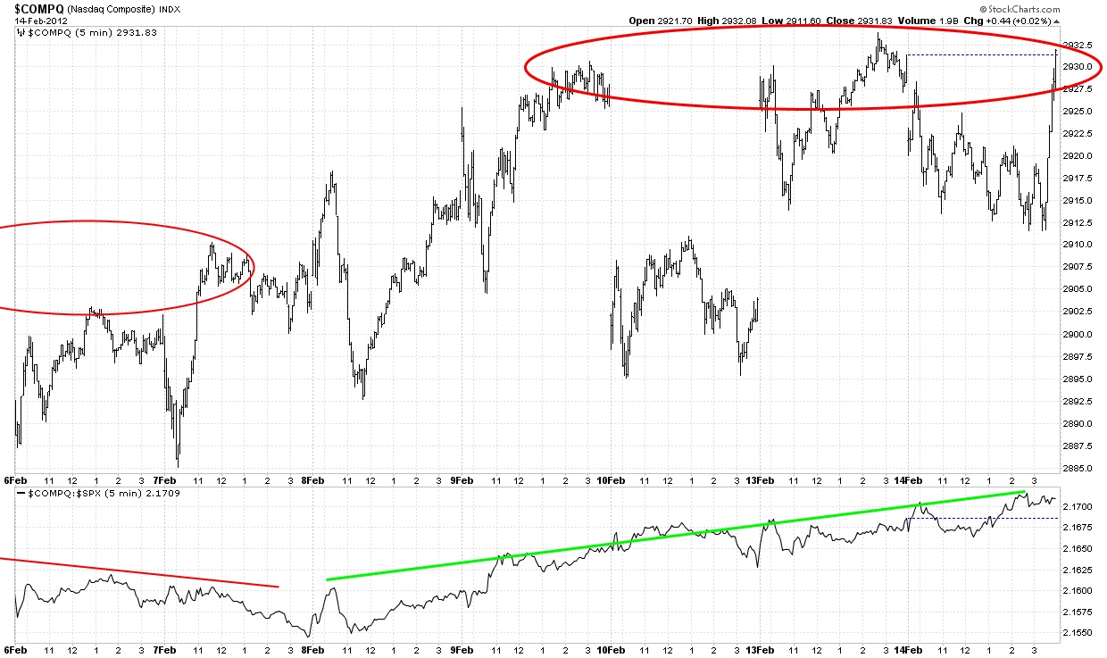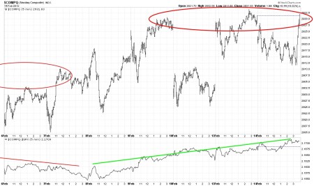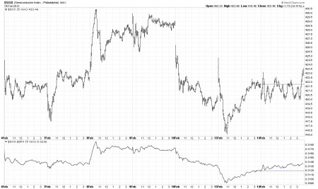 The semiconductor index is showing poor relative strength and is often an early indicator of market turns. It clearly shows two steps down but in an eager bull market, we often only have two steps down with a truncated third step. That may be possibly indicated here and a higher high than 5 days ago will prove that case.