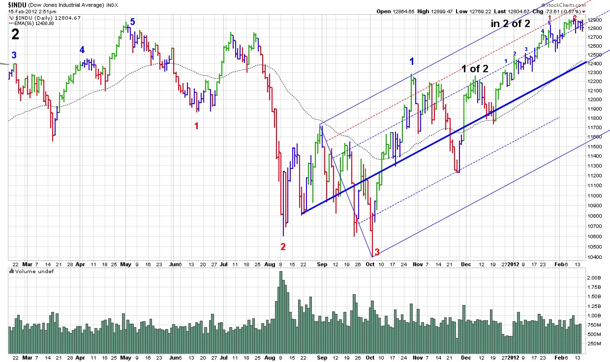 In one of the mechanical signal methods used on page 1 of my chart link, chart number 10.8, we are very close to a sell signal. With paper profits of about 100 points in the SP 500, this method is going to have a very good trade for its first transaction of 2012. In the real world of my interpretations, I believe that we could have one more upthrust with new recovery highs before a correction takes place. Until that happens, we may not see any real signs of a correction but I’m receptive to a correction beginning at any moment. I still believe that my “no more buying” was the correct move but it may not be readily apparent for another week or two. If the correction comes, I will issue a renewed buy signal at the conclusion of the correction. I have had several qualified buy signals in recent months (since Oct 4th).
