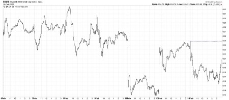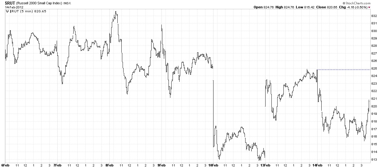The Russell 2000 index (RUT) has been declining for several days, but today formed a higher low and all that is needed is for a higher high than Monday’s close. If today’s late rally carries over into tomorrow, we could easily best the Monday close.