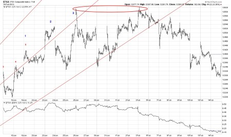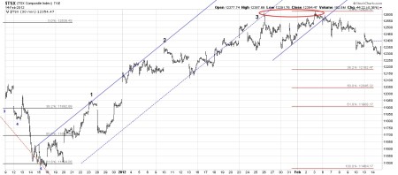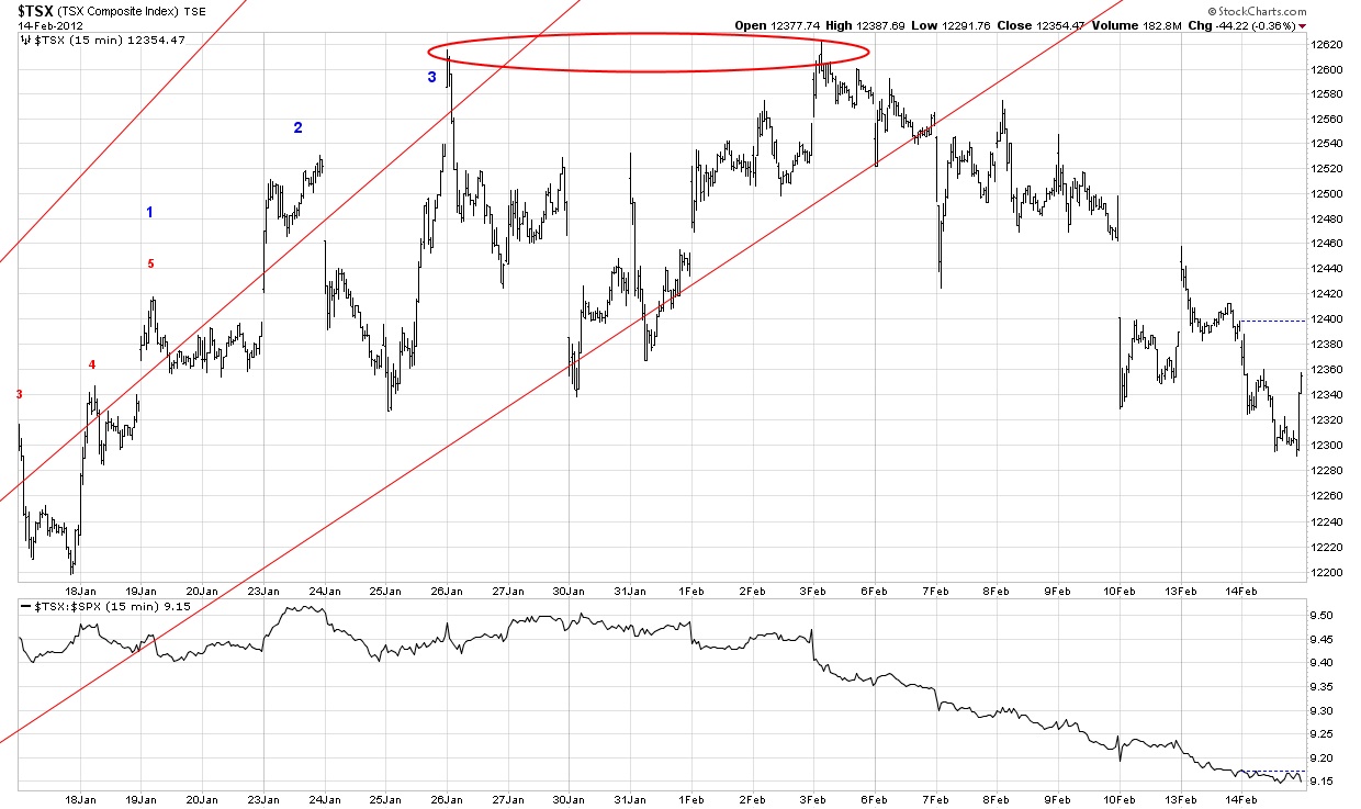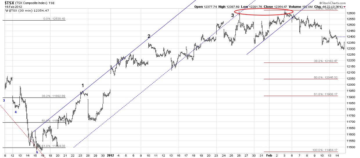 The 30 minute TSX chart shows exactly what has happened since the December 19th bottom. This index formed a bottom on December 15th. Nice leading motion by the index showing the way for the bottom on the 19th. You can see that the index counts very nicely since the December bottom with an obvious channel break taking place since the first peak on January 26th. The red Fibonacci levels indicate possible stopping points on the way down. Any correction that turns up before it makes it to the 38% level must be deemed strong and eager to go up. We’ll see what happens here, but I could make a case for a 3 step down since the second peak on February 3rd.