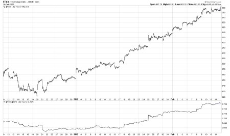 The technology index stocks are showing good strength with a new recovery high today. That is certainly not an indication of any corrective type action. This index has been in a solid uptrend since the December 20th bottom.
