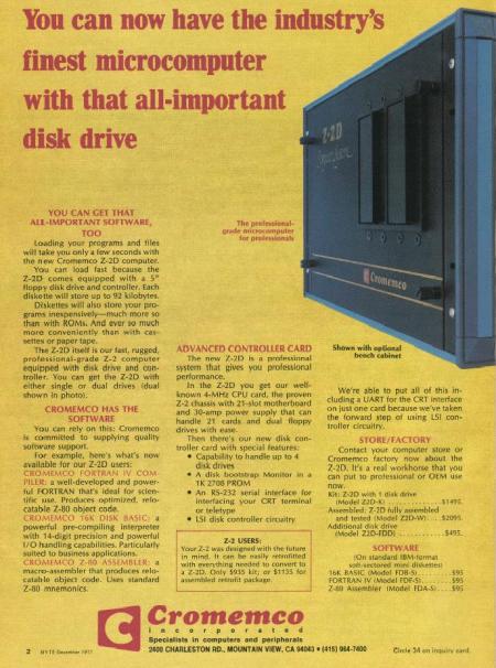 The following picture is a page from a magazine advertising the Cromemco computer in 1977. By assembling the computer from a kit I saved about $600. The assembly procedure required me to solder every electrical component to the printed circuit boards. My 13 year old daughter helped me and she was a really big help too. She was fascinated by this enormous task that I had undertaken, but she also knew her father was nuts.