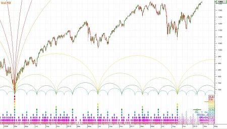 May is also the date of an interesting Fibonacci time sequence. We have two Fibonacci arcs ending in May 2012. One arc originates from the October 2002 low and terminates on the October 2007 peak. The second arc originates from the October 2007 peak and terminates on the March 2009 low. I have no idea if these arcs will be significant but I find them interesting due to their convergence and the anticipated cyclic low. If you study some of the ending dates for the other arcs in the chart, you will see that some terminated near important market dates.