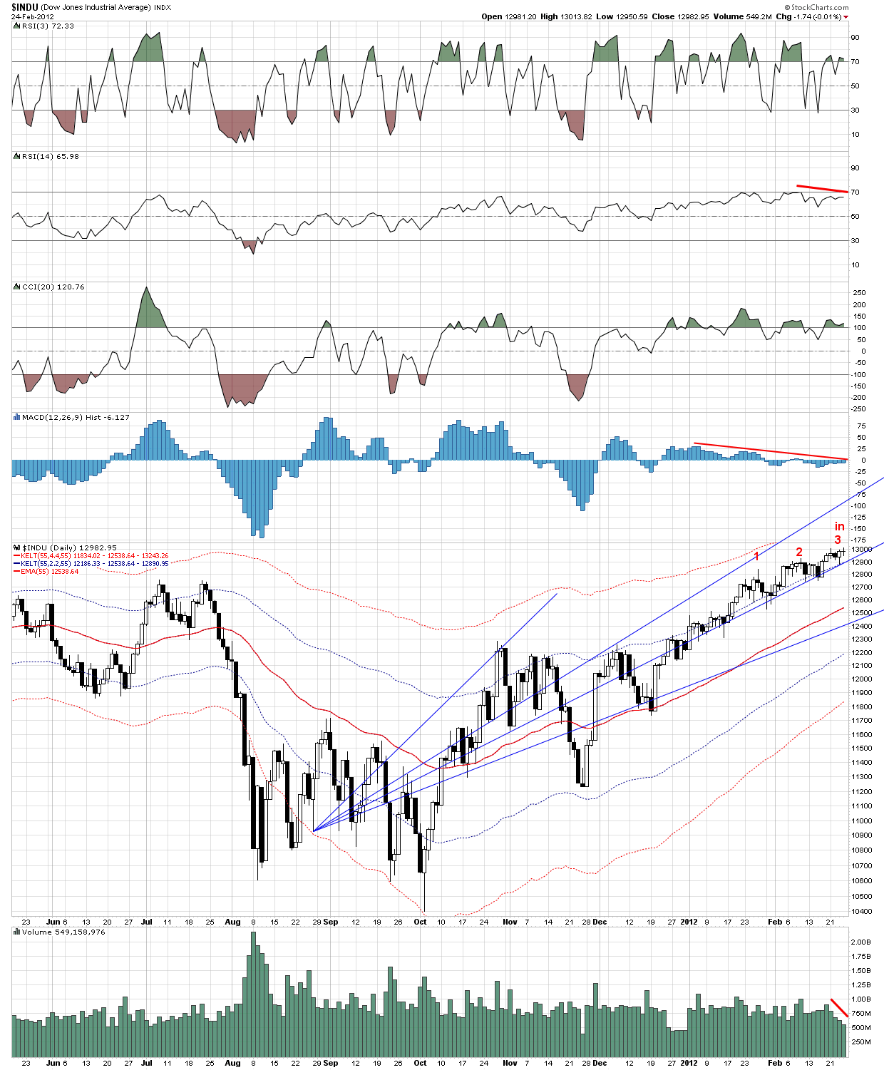 The only caveat would be that since we have achieved new highs above May 2011 (some indexes) and that satisfies the bare minimum for a third step since March 2009. It doesn’t seem likely that we would have a truncated third step but investment survival dictates that we always look at all sides of the situation.