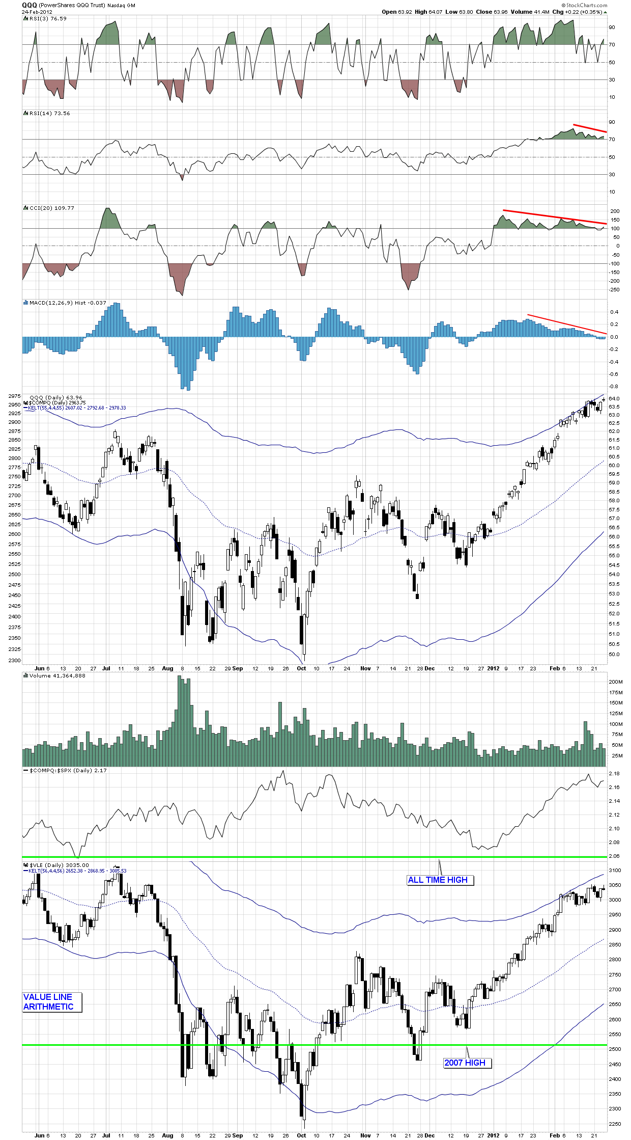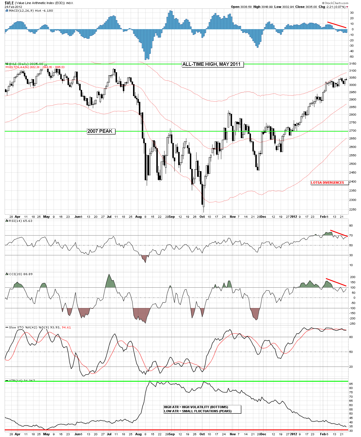 The Value Line Index was a very big leader beginning in March 2009 achieving significant new all-time highs beginning in 2010 and continuing through May 2011. Presently I find it troublesome that it can’t exceed its May 2011 peak. It lags well behind, while a few of the other indexes have broken through their May 2011 peaks.