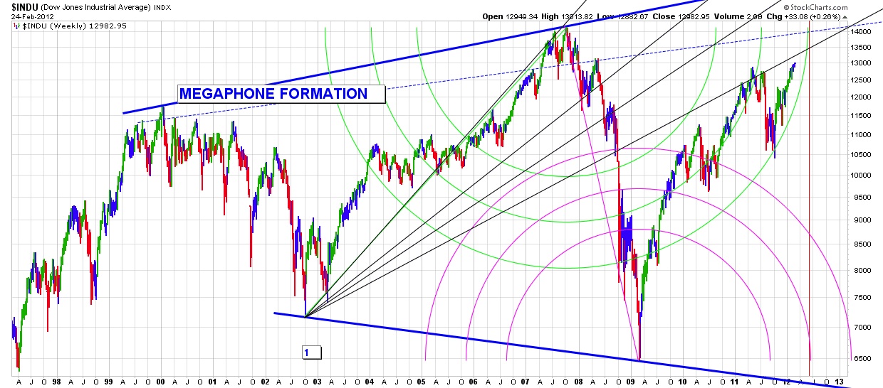 If you want to get really spooked Wicked Laugh. Large step 1 up ended in May 2010 and large step 2 up ended in May 2011. That’s pretty freaky coincidence, right??? But will large step 3 up end in May 2012??? Hopefully not, because I have greater expectations for this bull market (megaphone formation) than what could be fulfilled by May 2012 (megaphone illustrated on the following chart).
