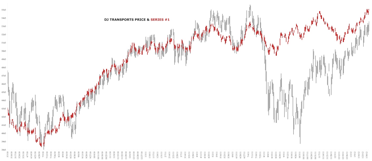 This is my super secret buy/sell indicator (Series #1) in red. The chart show the Industrials and series #1 since May 2010. The decline from May to October 2011 was not reflected in the series #1 indicator. I would interpret this as investors continuing to exert a continuous buying influence on the market.