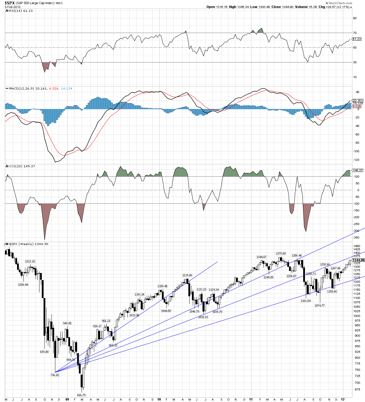 The Nasdaq composite on Friday also exceeded its May 2011 high. There was no resistance, it gapped right through the old highs. It’s almost always good market action to see the Nasdaq leading the advance. When this index begins lagging we’ll know that a correction is near.