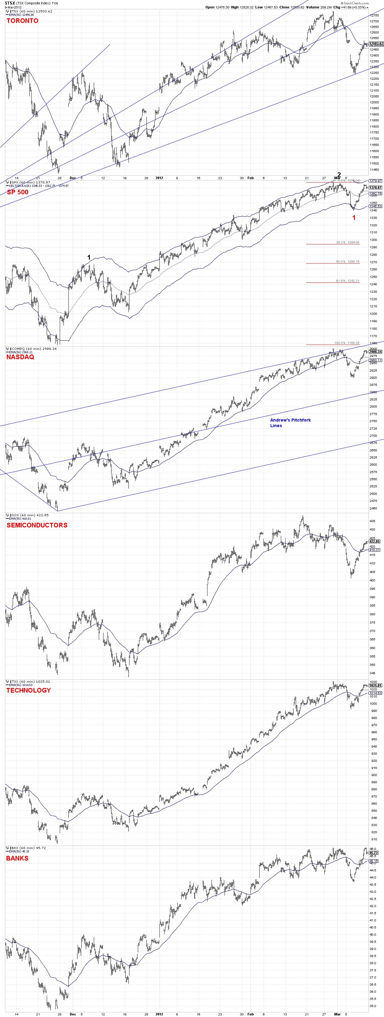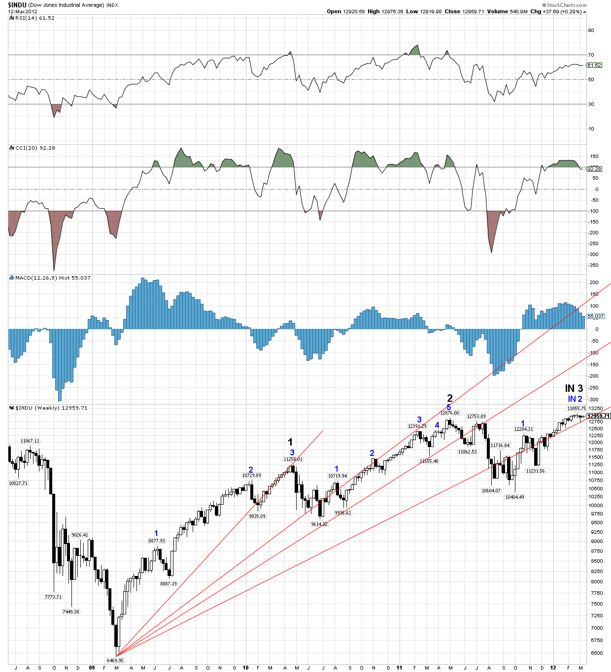 It’s obvious that the market has been steadily losing momentum and should begin (or has already begun) a small correction. The SP 500 count indicates that we have just completed step 2 up counting from the late November 2011 bottom (see SP 500 in the chart below). If this count is correct, we should have one more stab at last week’s highs before the market rolls over into a correction that will last more than a few days. BUT looking at the count in some of the other indexes could lead one to believe that the count is complete on the upside and the correction will be underway soon. Either way we are in the final stages of an advance that began in November.