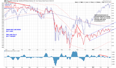 Junk bond sentiment, which I have called the canary in the coal mine for indicating economic conditions is still moving up in relationship to Treasury bonds but the pace is slow.