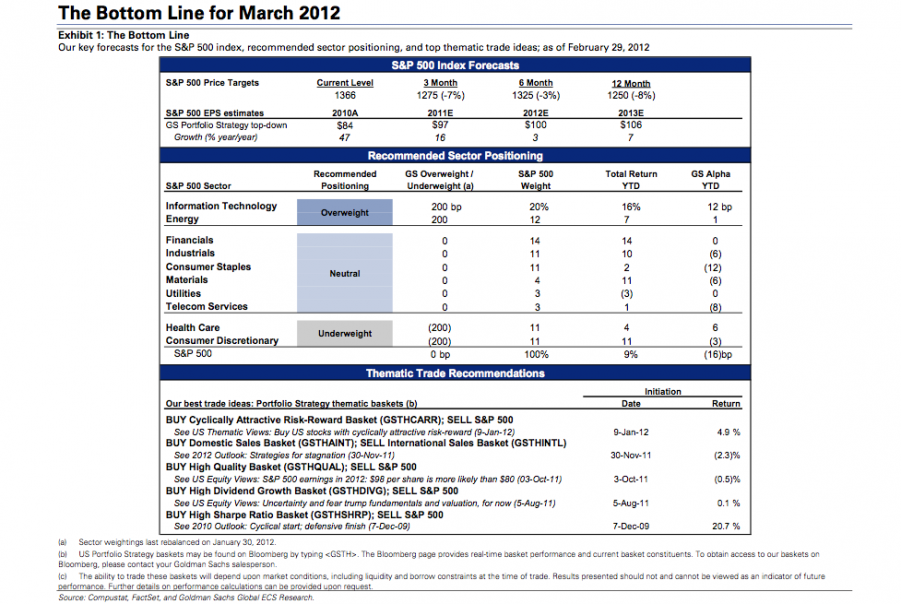 The following is the Goldman Sachs expectations for 2012. Goldman is expecting the stock market to be 8% lower a year from now.