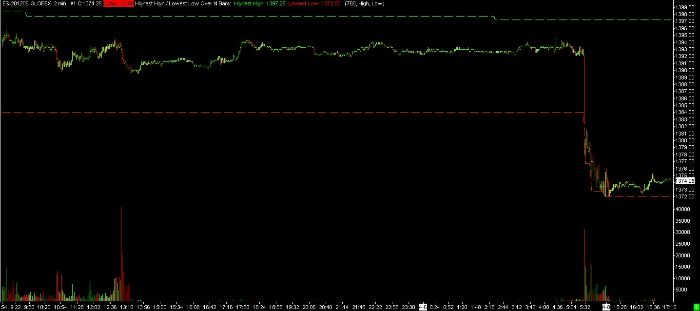 SP 500 futures from Sunday 04-09-12 at 8 PM EDT. The period for each bar is 2 minutes.