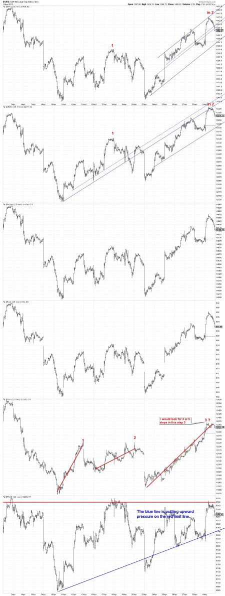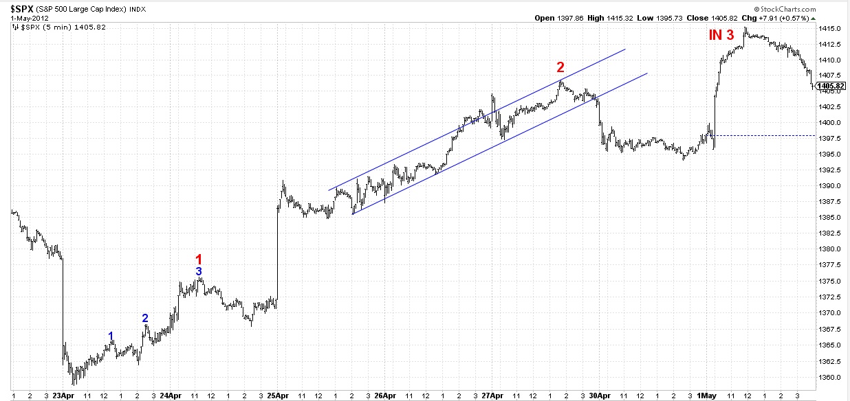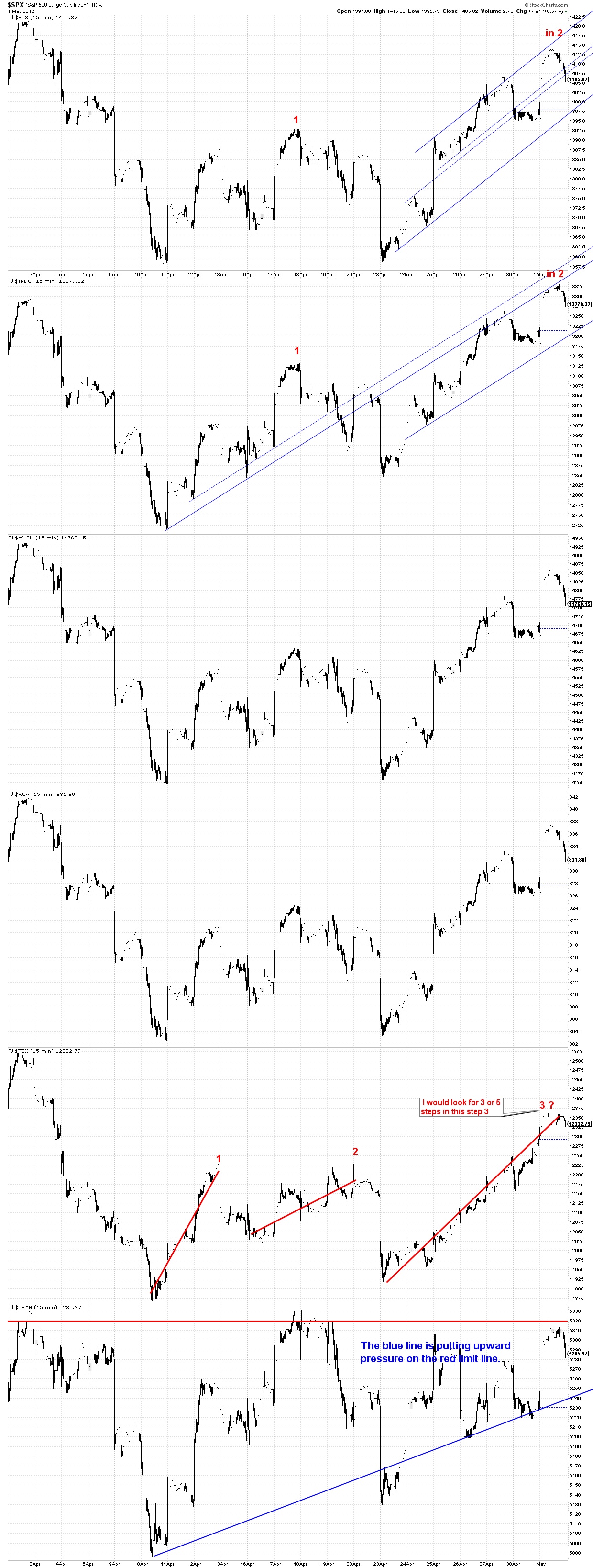 In the first chart, it appears that we have ended step 3 up counting from April 23rd.  An interesting point is that the daily wave count doesn’t agree with this chart.  The daily chart says that we have begun step 2 up since 4/23.  This difference will be resolved and if the market advances, the daily chart will likely win the argument.