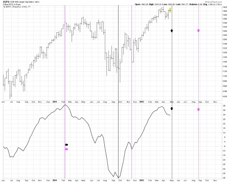My weekly T show an ending date next week (May 7-11) and late August.  The daily Ts show an ending date in late May and early September.  Both the daily and weekly T dates are in the “ballpark” of each other.  It was hoped that the daily chart could fine tune the T’s ending date, but I’m skeptical on the fine tuning.  Wait and see is the buzz-word.